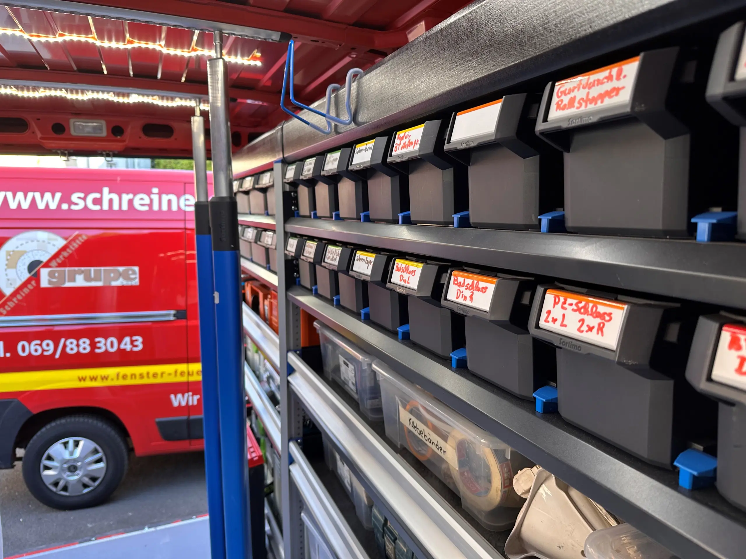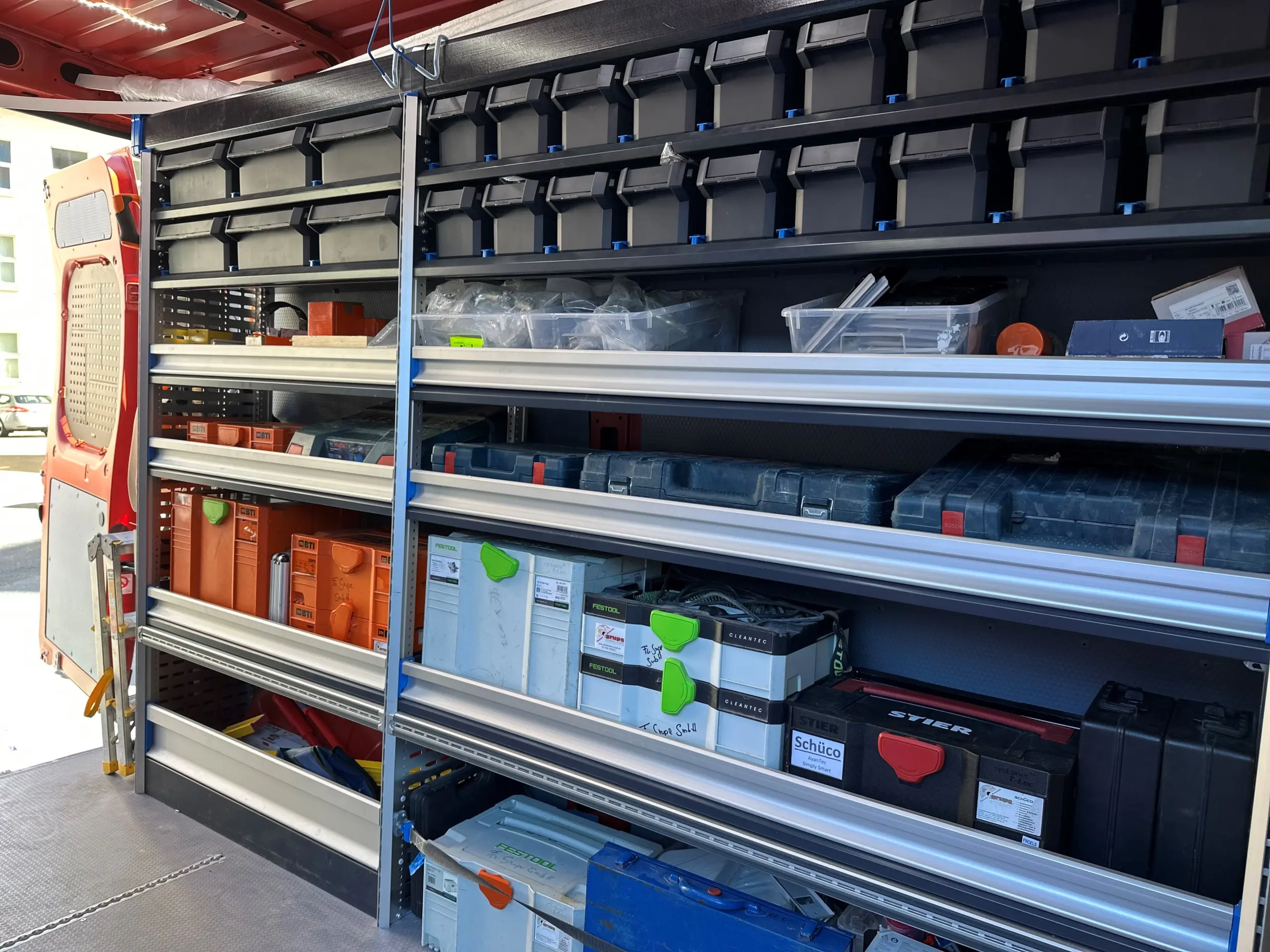 Unsere rot markanten Servicewagen sind mehr als nur Transportfahrzeuge. Sie sind rollende Werkstätten, in denen jedes Werkzeug und Ersatzteil seinen festen Platz hat. Das ermöglicht es uns, Reparaturen und Montagen oft schon beim ersten Termin vollständig durchzuführen – schnell, effizient und zuverlässig.
